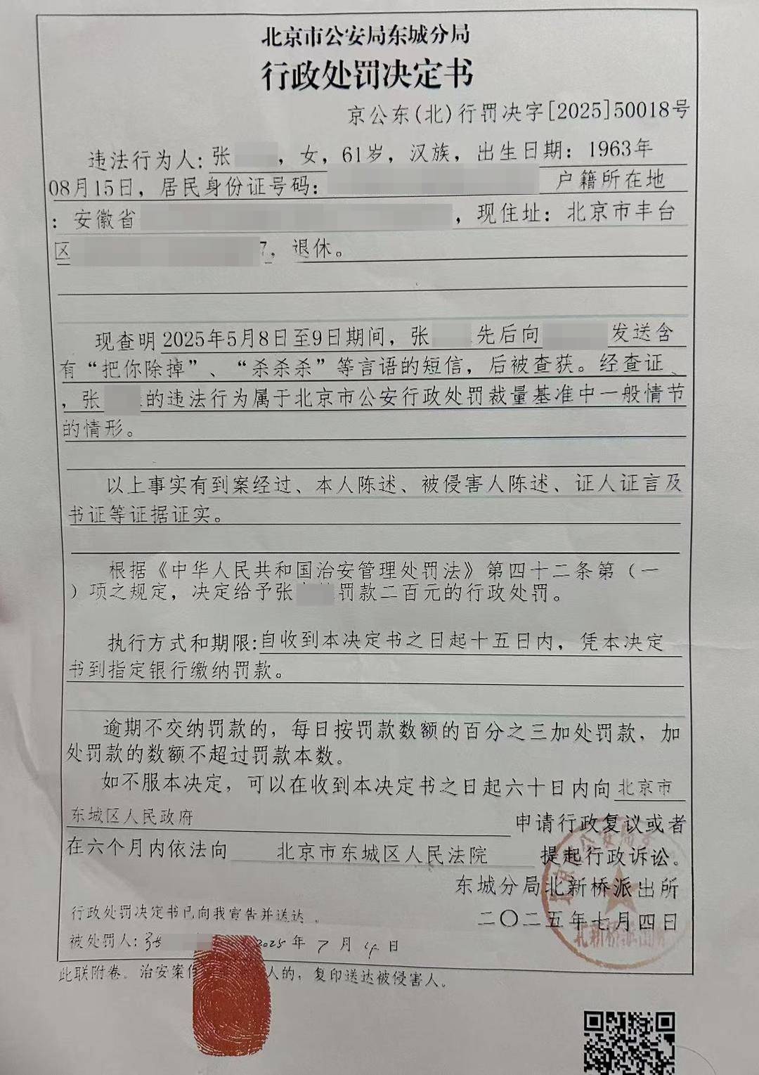 两份来自警方的行政案件立案告知书和行政处罚决定书显示,2025年5月8日,莫女士报案称被威胁人身安全案立案,7月4日,东城分局北新桥派出所查明张某某向莫女士发送含有“把你除掉”“杀杀杀”等言语的短信,违法行为属北京市公安行政处罚裁量基准中一般情节的情形,给予张某某罚款200元的行政处罚。